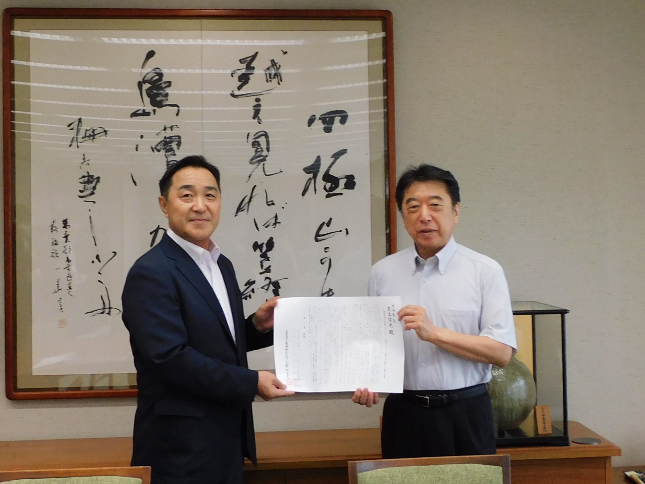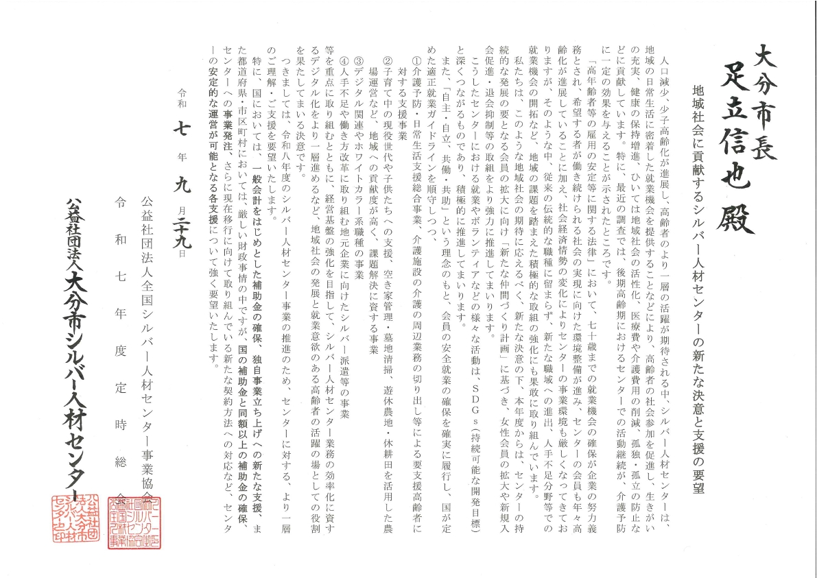 令和7年9月29日、大分市役所において江藤理事長が足立市長へ「地域社会に貢献するシルバー人材センターの決意と支援の要望」書を手渡し、シルバー事業への支援を要望いたしました。